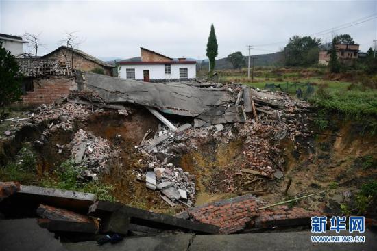 模沙村里,一處3層居民樓倒塌,房屋邊出現(xiàn)一個大坑(11月24日攝)。由于灰?guī)r水進入井下,江西宜春透水煤礦事故已造成距離煤礦1公里左右的模沙村局部地下水位急劇下降,并引發(fā)地面開裂、局部塌陷等情況,部分房屋出現(xiàn)裂縫甚至倒塌。目前,在有關部門組織下,模沙村在家村民已全部安全撤離。 11月22日23時10分左右,江西省宜春市袁州區(qū)西村鎮(zhèn)北槽煤礦發(fā)生透水事故。