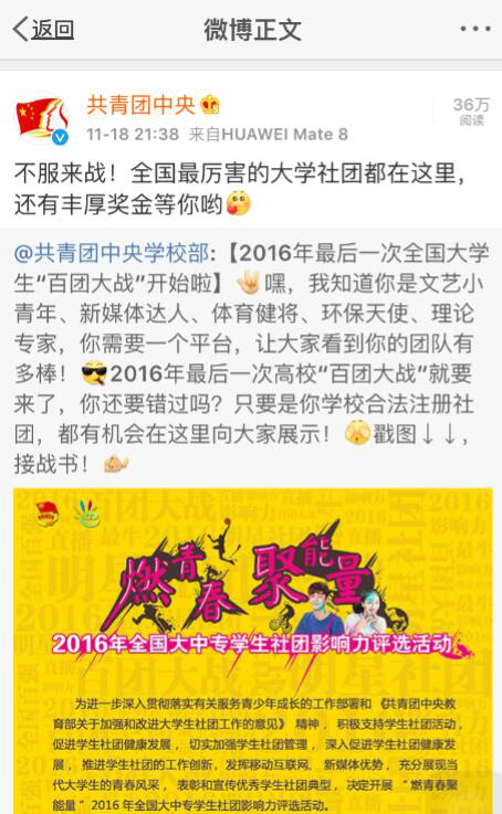“不服來戰(zhàn)!全國最厲害的大學(xué)社團都在這里……”近日,共青團中央官方微博發(fā)布了這樣一條微博。