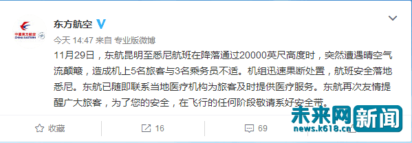 東方航空官方微博于14:47便回應(yīng)此事稱,11月29日,東航昆明至悉尼航班在降落通過(guò)20000英尺高度時(shí),突然遭遇晴空氣流顛簸,造成機(jī)上5名旅客與3名乘務(wù)員不適。機(jī)組迅速果斷處置,航班安全落地悉尼。東航已隨即聯(lián)系當(dāng)?shù)蒯t(yī)療機(jī)構(gòu)為旅客及時(shí)提供醫(yī)療服務(wù)。東航再次友情提醒廣大旅客,為了您的安全,在飛行的任何階段敬請(qǐng)系好安全帶。