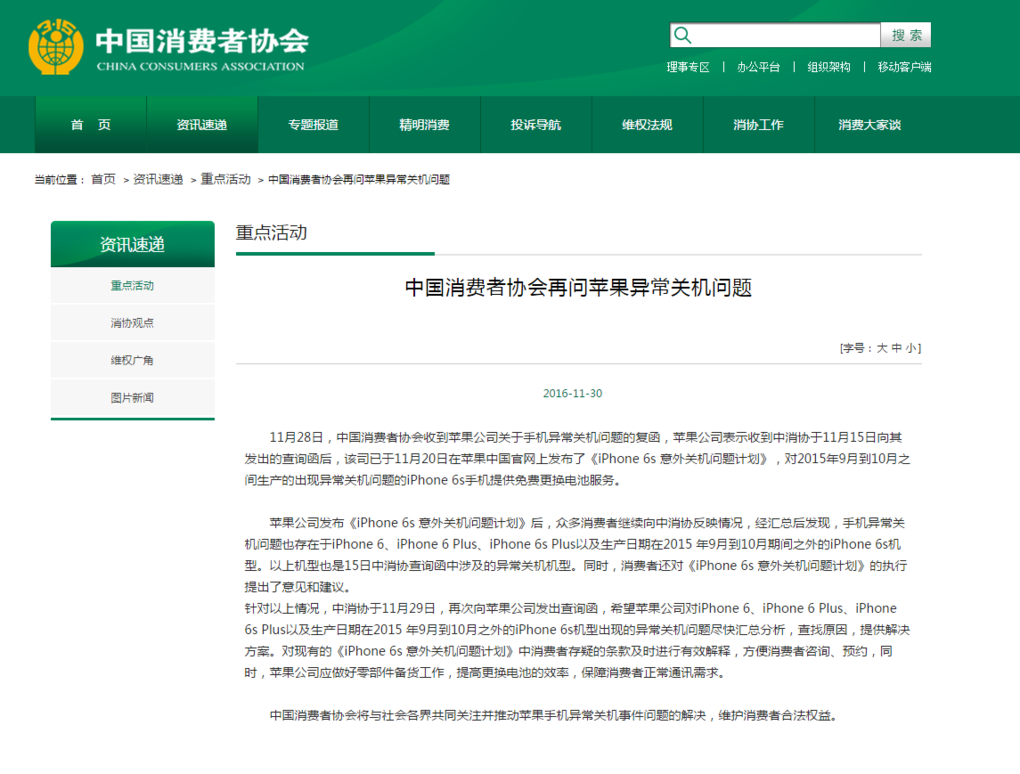 11月28日,中國(guó)消費(fèi)者協(xié)會(huì)收到蘋果公司關(guān)于手機(jī)異常關(guān)機(jī)問(wèn)題的復(fù)函,蘋果公司表示收到中消協(xié)于11月15日向其發(fā)出的查詢函后,該司已于11月20日在蘋果中國(guó)官網(wǎng)上發(fā)布了《iPhone 6s意外關(guān)機(jī)問(wèn)題計(jì)劃》,對(duì)2015年9月到10月之間生產(chǎn)的出現(xiàn)異常關(guān)機(jī)問(wèn)題的iPhone 6s手機(jī)提供免費(fèi)更換電池服務(wù)。