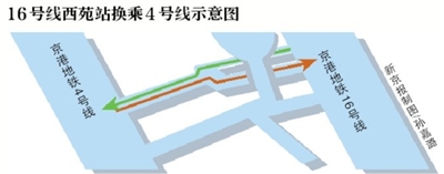 在16號線西苑站南側(cè)約120米處,是已經(jīng)開通運(yùn)營的4號線西苑站。16號線與4號線在西苑站“牽手”,兩線通過兩條約6米寬、120米長的Y字形通道在站廳層實(shí)現(xiàn)換乘,寬敞且位于同層的換乘通道將為乘客節(jié)省很多時(shí)間,從該站換乘4號線只需3分鐘。