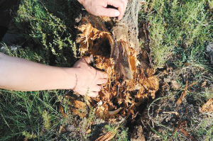 8月21日,在河北省張北縣張化線一側(cè)的楊樹林,一棵已經(jīng)枯死的楊樹樹根已經(jīng)腐爛