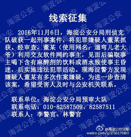目前海淀警方發(fā)現(xiàn)嫌疑人董某有多次作案嫌疑,為進(jìn)一步查清該案,希望受害人及時(shí)與公安機(jī)關(guān)聯(lián)系。