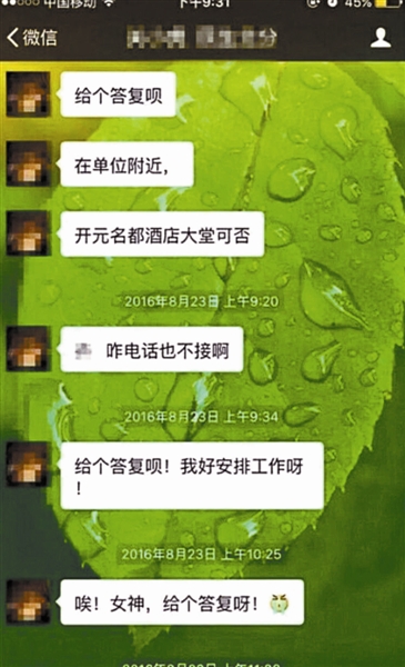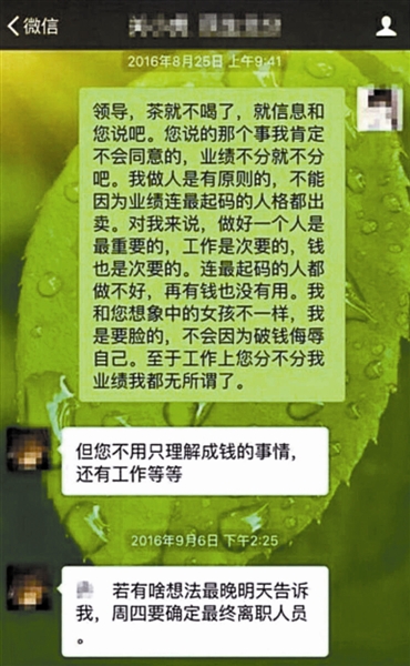 “周一早上在某某酒店喝茶可否?”“見面聊聊不會這么難吧?”“周四要確定最終離職人員……跟你說過,還有其他選擇,看你自己咋做了。”類似的騷擾消息,王琪(化名)已經(jīng)從業(yè)務(wù)副總經(jīng)理那里接收到很多次了。