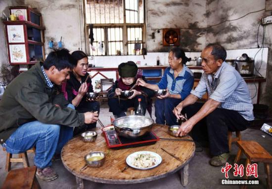 在“中國長壽之鄉(xiāng)”廣西桂林市恭城瑤族自治縣西嶺鄉(xiāng)嶺腳村,居住著目前桂林市年齡最大的長壽老人——114歲的王玉瓊。12月8日,記者探訪了這位百余歲長壽老人的生活。老人與人交談思維清晰,說話流利,還堅持每天自己打水洗澡、洗臉,自己打水洗衣服,生活自理,老人也一直有抽煙喝酒的習(xí)慣。圖為12月8日,王玉瓊與家人一起吃午餐。唐夢憲 攝