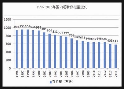 原料驢皮的短缺,是促使阿膠漲價的根本原因。根據(jù)國家畜牧統(tǒng)計年鑒顯示,毛驢存欄量已由上世紀90年代的1100萬頭下滑到500多萬頭,并且還在以每年超過3%的速度下降。