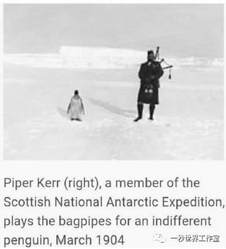 Piper Kerr(右一),蘇格蘭南極科考隊(duì)成員,于1904年3月為一只心不在焉的企鵝演奏風(fēng)笛!