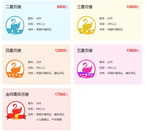 一家生活服務(wù)平臺(tái)公開(kāi)的月嫂價(jià)格顯示,在北京提供26天服務(wù),二星月嫂需要8800元,三星月嫂10800元,四星月嫂12800元,五星月嫂15800元,最高級(jí)別的金牌高級(jí)月嫂則要17800元。