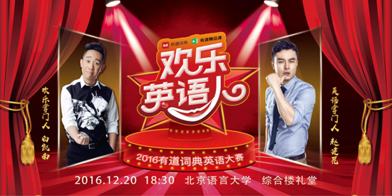 在經(jīng)歷了百萬人的激烈PK及近一個月緊鑼密鼓的比賽之后,國內(nèi)首個跨界英語競技活動——有道詞典“歡樂英語人”大賽即將迎來最終決選。12月20日,“歡樂英語人”全國總決賽將在北京語言大學舉行,來自全國各地的十強選手將會師京城,為英語愛好者們獻上一場掌聲與歡笑齊鳴的英語競技盛典。
