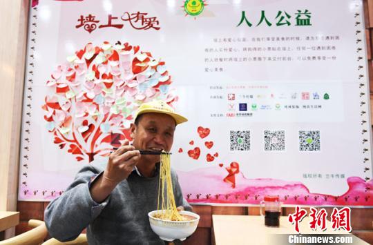 蘭州本地5家牛肉面連鎖品牌加入“墻上有愛,人人公益”愛心牛肉面活動。用餐的人提前購買牛肉面,將購得的小票貼在墻上并寫上祝福語,任何一位需要就餐卻遇到困難的食客,都可以將墻上的小票撕下來交到收銀臺,免費(fèi)享用牛肉面。圖為活動園地。 楊艷敏 攝