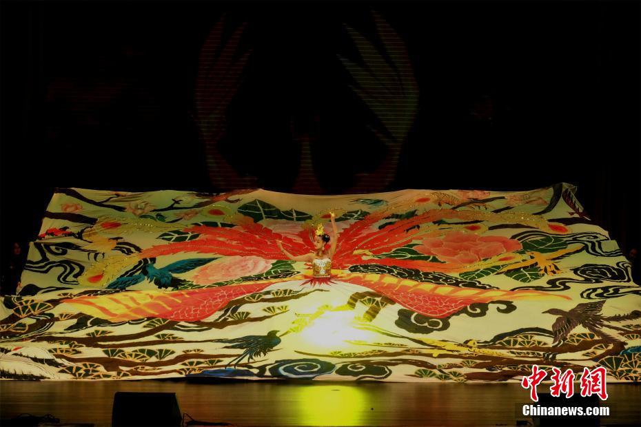 近日,在重慶理工大學(xué)會(huì)計(jì)學(xué)院年度頒獎(jiǎng)典禮暨文藝晚會(huì)上,當(dāng)晚壓軸出場的舞蹈《百鳥朝鳳圖》,令現(xiàn)場千余名師生贊嘆不已,發(fā)布到網(wǎng)上后火爆了微信朋友圈。據(jù)了解,該作品是重慶理工大學(xué)三名95后女大學(xué)生純手工打造的,從設(shè)計(jì)到制作共歷時(shí)兩個(gè)月時(shí)間,從討論到設(shè)計(jì)定稿、畫圖上色、縫制金線,再到成衣,這件《百鳥朝鳳圖》裙擺長約9米、寬約8.5米,以人身為鳳頭,裙擺為鳳翼,展開就宛如浴火重生的鳳凰一般。鐘欣 攝