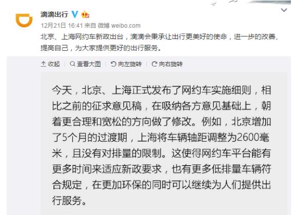 細則出臺后,各大網(wǎng)約車平臺第一時間做出了應(yīng)對。滴滴官方的公告看起來十分樂觀,“相比之前的征求意見稿,網(wǎng)約車實施細則在吸納各方意見基礎(chǔ)上,朝著更合理和寬松的方向做了修改!倍裰莸幕貞(yīng)則略顯無奈,“北京、上海公布的網(wǎng)約車新政跟之前的征求意見稿相比變化不大”,還表示會跟有關(guān)管理部門保持溝通。