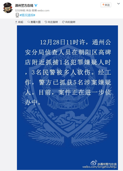 中新網(wǎng)12月29日電 據(jù)北京市公安局通州分局官方微博消息,12月28日11時(shí)許,通州公安分局偵查人員在朝陽區(qū)高碑店附近抓捕1名犯罪嫌疑人時(shí),3名民警被多人砍傷。經(jīng)工作,警方已抓獲5名涉案嫌疑人。