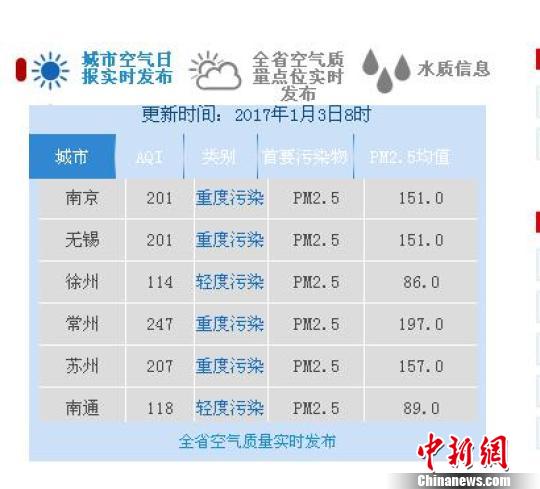圖為3日,江蘇各地空氣質(zhì)量均受到不同程度污染。官網(wǎng)截圖 攝