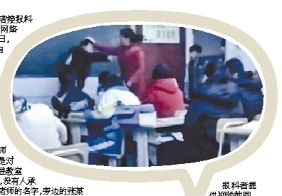 在報料者向記者提供的一段時長9秒的視頻顯示,事發(fā)時一學(xué)生在教室黑板前被一著紅色棉衣的女教師抓住頭發(fā),被打?qū)W生雖極力反抗,但仍被紅衣女教師連扇數(shù)耳光,同時,教室門外還站著兩個學(xué)生,教室內(nèi)的學(xué)生一片寂靜。