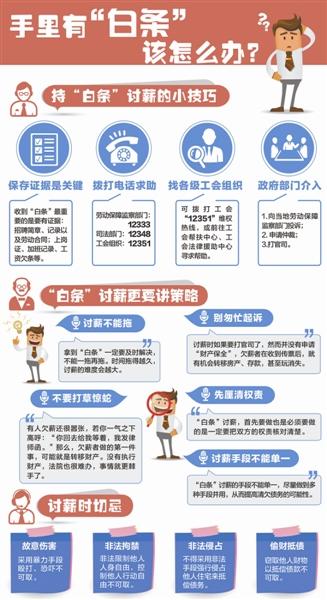 據(jù)了解,由于“白條”與現(xiàn)行的法律法規(guī)相悖,很難得到法律的保護,如果相關(guān)部門要幫助持“白條”農(nóng)民工討薪,往往受到法律法規(guī)的限制,缺少對惡意欠薪者的震懾,效果自然也就大打折扣。農(nóng)民工群體由于自身知識結(jié)構(gòu)及閱歷等局限,仍有人相信“白條”,導(dǎo)致很難拿到工資。