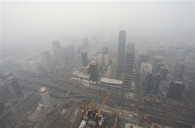 1月7日,北京中國尊,距離地面432米處俯瞰國貿(mào)區(qū)域被霧霾籠罩著。 新京報記者 王飛 攝