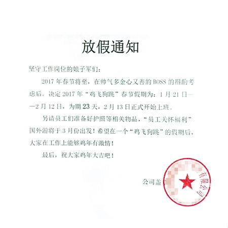 “春節(jié)要放23天,這家公司的老板怎么這么帥,還招人嗎?”昨日,重慶一家公司的春節(jié)放假通知在朋友圈火了,記者從放假通知上看到,該公司2017年春節(jié)放假時(shí)間從1月21日一直持續(xù)到2月12日,有整整23天。放假通知一出,不少網(wǎng)友留言稱“敢問(wèn)老板還招人嗎?”