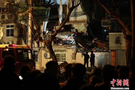 1月11日20時53分,上海市公安局指揮中心接110報警,楊浦區(qū)控江路398號一幢四層樓房二樓、三樓的外立面坍塌。中新社記者 張亨偉 攝