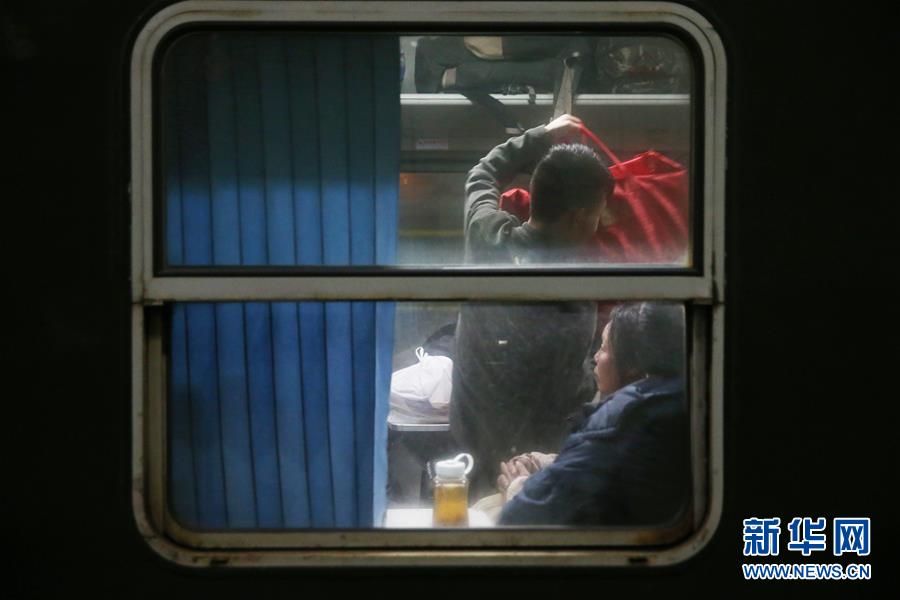 1月13日凌晨,旅客在由上海南發(fā)往重慶北的3055次列車內(nèi)放置行李。此趟列車是由上海始發(fā)的第一列春運列車。當(dāng)日,為期40天的2017年春運開始。預(yù)計2017年春運期間,全國旅客發(fā)送量將達(dá)到29.78億人次,比上年增長2.2%。 新華社記者丁汀 攝