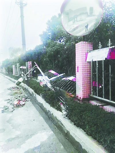 事發(fā)現(xiàn)場(chǎng),路燈柱子砸垮鐵欄圍墻 工友供圖