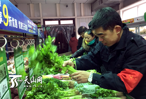 1月16日早上,烏魯木齊市水磨溝區(qū)六道灣片區(qū)管委會(huì)克拉瑪依東路社區(qū)便民蔬菜直銷點(diǎn)店長(zhǎng)王森(右)正在整理貨架。