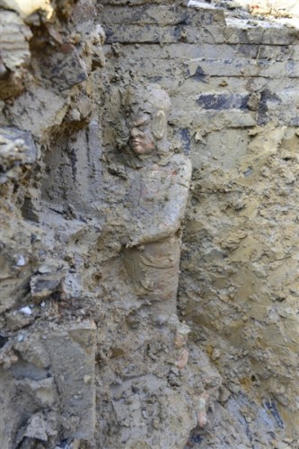 隨后,成華區(qū)文化廣電新聞旅游體育局聯(lián)合成都市文物考古隊(duì)對現(xiàn)場進(jìn)行發(fā)掘,一座宋代磚室墓?jié)u漸露出泥土,墓門口,一尊高達(dá)0.8米的武士俑鎮(zhèn)守墓門,墓室內(nèi)散落的二十多枚錢幣依然保存完好,從上面可以清晰辨認(rèn)出“崇寧通寶”(崇寧是宋徽宗年號)等字樣。據(jù)成華區(qū)文旅體局文物科負(fù)責(zé)人介紹,雖然周邊只發(fā)現(xiàn)了這一座宋墓,但為研究成都宋代經(jīng)濟(jì)、文化提供了重要資料。