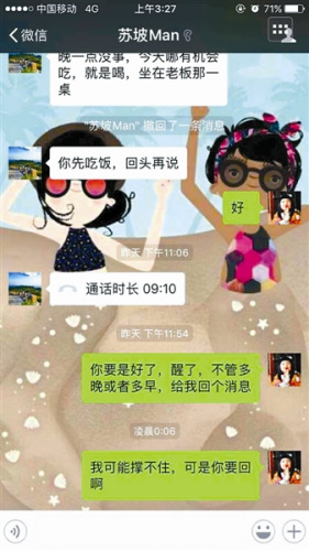 23時54分,琪琪在微信里留言:“你要是好了,醒了,不管多晚或者多早,給我回個消息!16日零點零6分,琪琪睡覺前留言“我可能撐不住,可是你要回啊”。
