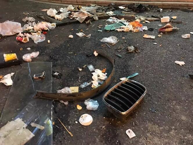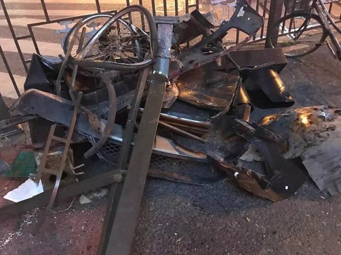 事故發(fā)生在昨晚10點(diǎn)多的中山北路文暉路口。錢(qián)江晚報(bào)記者趕到現(xiàn)場(chǎng)時(shí),受損車(chē)輛均已經(jīng)被拉走,但是現(xiàn)場(chǎng)狼藉慘狀,依然能感受當(dāng)時(shí)撞擊有多厲害。在現(xiàn)場(chǎng),靠近中山北路和文暉路交叉口西南側(cè)一角,堆放著還沒(méi)處理的碎片,里面有變形的自行車(chē),被撞斷的護(hù)欄鐵柱,車(chē)子上的各種配件。