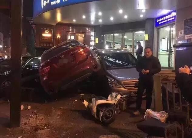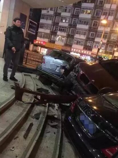 從照片上看,當(dāng)時(shí)受損的有5輛車(chē)。其中4輛事發(fā)后停在了西南角,一輛停在馬路中央。西南角的四輛車(chē)分別是兩輛奔馳,兩輛寶馬。其中一輛紅色X6寶馬騎在了兩輛奔馳中間,兩輛奔馳則被推到了西南角的臺(tái)階上。而一輛黑色奔馳因?yàn)槭艿綌D壓,又傷及到旁邊一輛寶馬。當(dāng)然受傷最重的要數(shù)紅色X6和被它“騎行”的兩輛奔馳了。