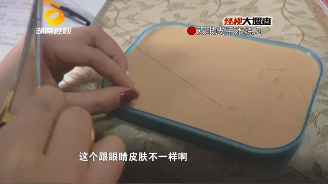 第一天上課劉老師講了雙眼皮的理論知識(shí),并聲稱眼部手術(shù)任何醫(yī)生都可以做,然而才過了半個(gè)小時(shí),老師便講完了雙眼手術(shù)的所有理論知識(shí)。隨后,她給學(xué)員發(fā)了一個(gè)練習(xí)皮,讓學(xué)員在上面練習(xí)。