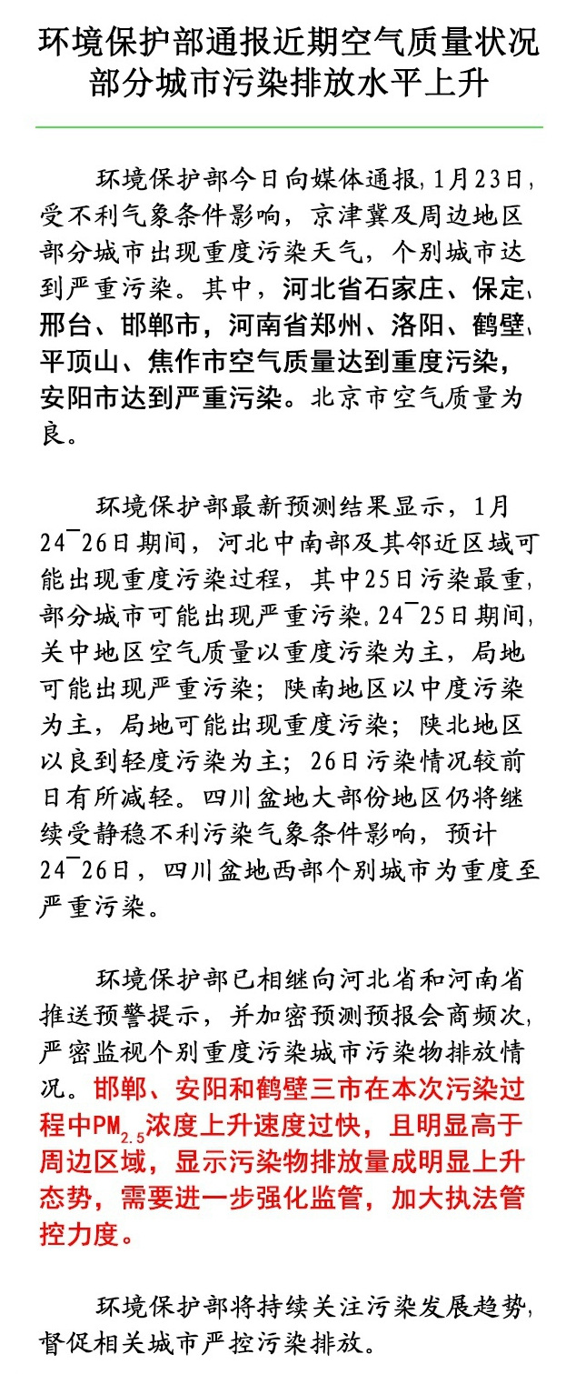 中新網(wǎng)1月24日電 據(jù)環(huán)境保護(hù)部宣傳教育司官方微博消息,環(huán)保護(hù)今日通報(bào)近期空氣質(zhì)量狀況,稱京津冀及周邊地區(qū)部分城市出現(xiàn)重度污染天氣。其中,邯鄲、安陽和鶴壁三市在本次污染過程中PM2.5濃度上升速度過快,且明顯高于周邊區(qū)域,顯示污染物排放量成明顯上升態(tài)勢,需要進(jìn)一步強(qiáng)化監(jiān)管,加大執(zhí)法管控力度。