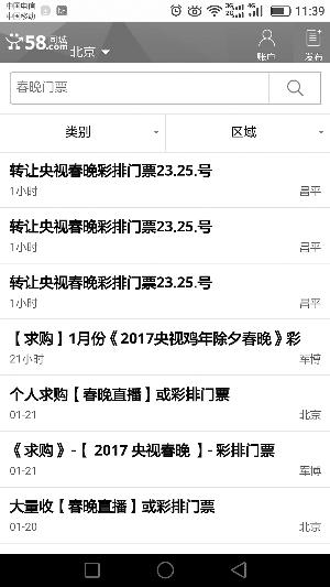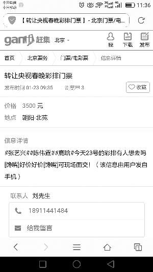 昨天,記者在58同城、閑魚(yú)等多家網(wǎng)絡(luò)平臺(tái)上看到有人出售春晚彩排門(mén)票。在趕集網(wǎng)上搜索“春晚彩排門(mén)票”,頁(yè)面上會(huì)跳出六七條相關(guān)帖子。其中一則“轉(zhuǎn)讓央視春晚彩排門(mén)票”的帖子,提示當(dāng)紅明星鹿晗、張藝興彩排等信息,標(biāo)注的價(jià)格為3500元。