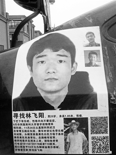林少卿夫婦承認(rèn),涉恐通告是假的,但尋人卻是真事,林飛陽(yáng)是夫妻倆失聯(lián)了一年多的兒子。這份以警方名義發(fā)布的通告,和一年間在多地出現(xiàn)的一份尋人啟事類似,上面有林飛陽(yáng)的多幅照片。尋人啟事中提到,林飛陽(yáng)身高1.85米,下巴有傷疤,2015年11月26日獨(dú)自一人從莫斯科回武漢后在天河機(jī)場(chǎng)失蹤。