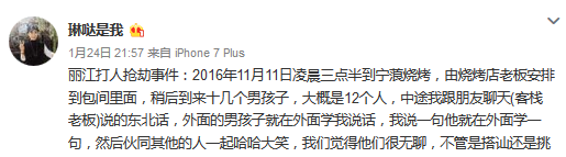 麗江打人搶劫事件:2016年11月11日凌晨三點(diǎn)半到寧蒗燒烤,由燒烤店老板安排到包間里面,稍后到來(lái)十幾個(gè)男孩子,大概是12個(gè)人,中途我跟朋友聊天(客棧老板)說(shuō)的東北話,外面的男孩子就在外面學(xué)我說(shuō)話,我說(shuō)一句他就在外面學(xué)一句,然后伙同其他的人一起哈哈大笑,我們覺(jué)得他們很無(wú)聊,不管是搭訕還是挑釁的意思,我們沒(méi)有理會(huì),繼續(xù)吃烤聊天,隔一會(huì)對(duì)方又開(kāi)始學(xué)我們說(shuō)話,這一次學(xué)完我們說(shuō)話還辱罵我們,之后我們就問(wèn)他什么意思,是不是喝多了酒,起初他們還沒(méi)有回復(fù),之后我們就各自吃烤肉了,其中有個(gè)穿藍(lán)色馬甲的中年男人,到我們我們間的門(mén)口打量我們包間,我們就不知道什么意思,我們還是繼續(xù)吃烤肉,之后他們就拿起酒瓶子進(jìn)我們的包間,把酒瓶子砸到我們頭上,我們當(dāng)時(shí)就是暈的,之后我就被那三四個(gè)男人拉著頭發(fā)給拖到燒烤店的門(mén)口外面,一頓暴打,一邊錄視頻一邊打,之后覺(jué)得錄視頻的效果不好,又扯著我的頭發(fā)面朝天的樣子,繼續(xù)錄視頻暴打我,一邊打一邊還說(shuō):你不是東北人?你不是很牛逼嗎?然后就哈哈大笑,把我打得滿臉都是血,還在拿碎掉的酒瓶子劃我的臉,之后他們?nèi)コ闊熜菹⒘,在我流血的過(guò)程,他們要求我按照他們說(shuō)的話去說(shuō),不然就把我拖到山上去給埋了,威脅我的內(nèi)容是:小妹妹,你是不是自己從樓上掉下來(lái)摔成這樣的?要不要哥哥們幫你打120?要不要哥哥們救你。课覀兛茨愫每蓱z啊。我學(xué)著他們的話去說(shuō),這個(gè)過(guò)程他們是全程錄視頻的,反偵察的能力很強(qiáng),說(shuō)完之后就繼續(xù)打我,又了打了一頓,最后這次打完我,臨走之前有個(gè)狠狠地踢我一腳。我直接噴血了。這一腳我直接不行啦,上不來(lái)氣了,他們走之前丟給我手機(jī),讓我自己打120 ,這是看我不行了,快死掉了,走的時(shí)候拿走我們身上帶的錢(qián),錢(qián)包和手機(jī),三個(gè)被打得人,只留了我這一部手機(jī),還是看我不行了,給我打電話自救的,我們?nèi)齻(gè)人被足足打了半個(gè)小時(shí),他們臨走之前還揚(yáng)言說(shuō):他們就是當(dāng)?shù)厝、不怕警察、隨便告、還說(shuō)在麗江在看到我、讓我有去無(wú)回....120是早上6:30左右來(lái)的,這期間我一直在流血,我打120的時(shí)候,我不知道燒烤店的名字,我問(wèn)燒烤店的老板,他說(shuō)完以后我就昏迷了,我們?cè)谶@個(gè)燒烤店被打這么久,燒烤店的老板沒(méi)有報(bào)警和打120,就眼睜睜的看著我們被打,后來(lái)警方得知這個(gè)燒烤店和那其中的一個(gè)人是認(rèn)識(shí)的,他們走的時(shí)候開(kāi)著一輛白色的轎車走的。