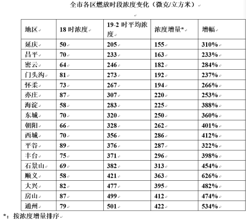 與除夕18時(shí)濃度整體處于良好的水平相比,除夕19時(shí)至初一2時(shí)全市各區(qū)平均濃度增量在233%-626%之間。其中,北部延慶、昌平、密云增幅最低,遠(yuǎn)離燃放區(qū)域的密云水庫(kù)PM2.5濃度始終保持在100微克/立方米以下;城區(qū)增幅次之,海淀區(qū)為城六區(qū)中相對(duì)最好;位于南部到東部的通州、房山、大興、順義等郊區(qū)濃度抬升最為明顯。上述特征一定程度上反映了局地燃放強(qiáng)度的差異。