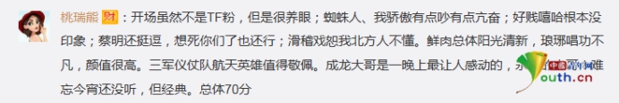對于整場春晚來講,也有網(wǎng)友發(fā)表了自己的看法。網(wǎng)友“桃瑞熊”表示:開場雖然不是TF粉,但是很養(yǎng)眼;蜘蛛人、我驕傲有點(diǎn)吵有點(diǎn)亢奮;好賤嘻哈根本沒印象;蔡明還挺逗,想死你們了也還行;滑稽戲恕我北方人不懂。鮮肉總體陽光清新,瑯琊唱功不凡,顏值很高。三軍儀仗隊(duì)航天英雄值得敬佩。成龍大哥是一晚上最讓人感動的,永遠(yuǎn)的大哥!難忘今宵還沒聽,但經(jīng)典?傮w70分。