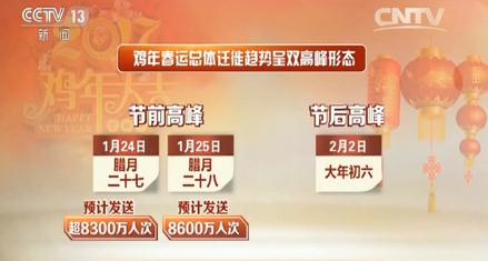 中國(guó)各地的火車站、長(zhǎng)途客運(yùn)站以及飛機(jī)場(chǎng)等,在巔峰時(shí)刻成為世界上人口最密集的地方之一。雞年春運(yùn)總體遷徙趨勢(shì)呈雙高峰形態(tài),1月24日(臘月二十七)、25日(臘月二十八)為節(jié)前高峰,而2月2日(大年初六)則為節(jié)后遷徙高峰;預(yù)計(jì)24號(hào)發(fā)送旅客總量超8300萬(wàn)人次;預(yù)計(jì)25日鐵路、公路、民航、水路日發(fā)送旅客總量達(dá)8600萬(wàn)人次。