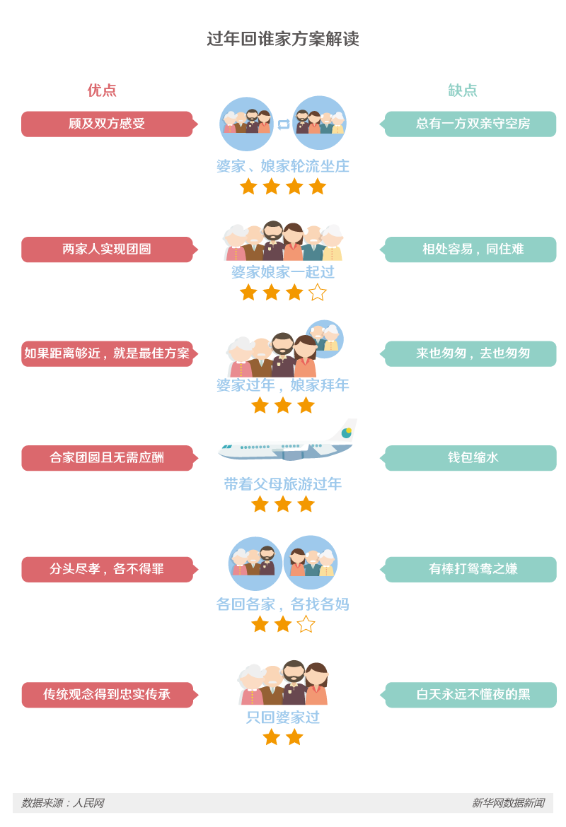 夫妻爭著回自己家陪父母過年,出發(fā)點(diǎn)都是為了盡孝,但若因此導(dǎo)致感情出現(xiàn)問題,甚至讓婚姻出現(xiàn)危機(jī),就未免舍本逐末。在此小編就對夫妻過年回家的幾種解決方案做個(gè)“評估”,供大家參考: