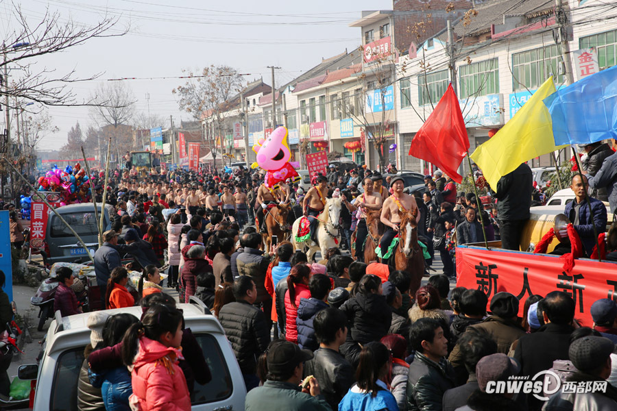 西部網(wǎng)訊(記者 魏永賢)2月9日,正月十三,周至集賢古鎮(zhèn)上演狂野古樸的精身子打社火。集賢村東村、西村、新城村、北街村四個村的老少爺們光著身子不畏嚴寒或騎馬或行走跑步,在四個村之間巡游,引得四鄰八鄉(xiāng)群眾紛紛圍觀,因男人們大多參與精身子打社火活動,圍觀的人中多為女性。