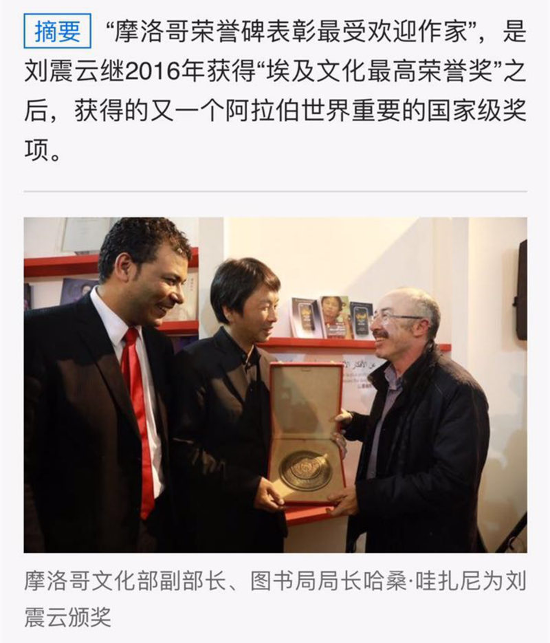 哈!の衷峋痛耸卤硎荆骸爸袊(guó)某些媒體的報(bào)道嚴(yán)重失實(shí),摩洛哥文化部沒有設(shè)立過(guò)這個(gè)獎(jiǎng)項(xiàng),我也不是副部長(zhǎng),只是以卡薩布蘭卡國(guó)際書展主席的身份為劉震云先生頒發(fā)了獎(jiǎng)牌,以表彰他為推動(dòng)摩中兩國(guó)文化交流做出的貢獻(xiàn)。”