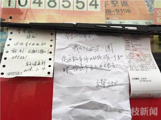 “貼了一張條說(shuō),警察同志,我回家拿一下東西,馬上就回來(lái),敬請(qǐng)你原諒!敝熘胰A告訴記者,“貨車(chē)停在小區(qū)門(mén)口,可能人家真有急事,人性化執(zhí)法,我們就想算了吧,而且他馬上就走了,不妨礙交通就行了。”見(jiàn)著紙條上語(yǔ)氣誠(chéng)懇,而說(shuō)好“馬上就到”,交警就網(wǎng)開(kāi)一面,和同事到別處巡邏。