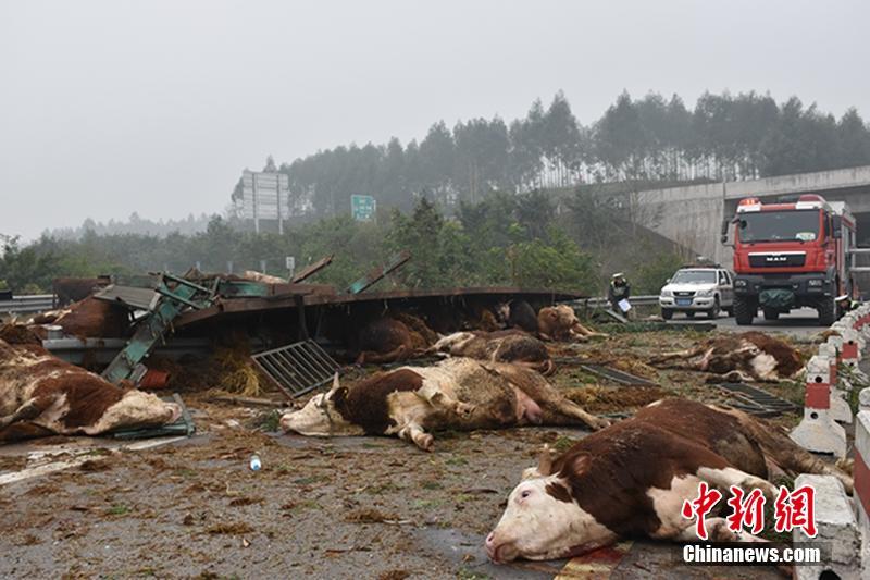 記者2月18日從重慶消防部門獲悉,當天上午11時許,重慶豐都G50S高速路高家鎮(zhèn)下道口匝道上,一輛滿載48頭牛的大掛車側翻在匝道上,造成車內(nèi)2人受傷,車上多數(shù)活牛被摔翻在周圍。事故造成該下道口暫時封閉。豐都消防大隊指揮中心接警后迅速出動前往現(xiàn)場,經(jīng)過40分鐘的緊張救援,成功將被困人員救出。黃華 攝