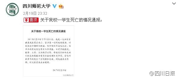 據(jù) @四川師范大學(xué)官方微博消息:2017年2月19日下午3點(diǎn)10分,一大四學(xué)生在寢室死亡。