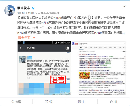 連日來(lái),微博、微信朋友圈有消息稱:“淮南一市民昨天下午因吃大盤雞感染H7N9死亡,25歲,孩子1歲,參與搶救的醫(yī)生已被隔離,緊急通知,暫時(shí)別吃雞肉鴨肉。因安徽渦陽(yáng)縣5570頭家禽已感染。收到馬上發(fā)給你關(guān)心的人,預(yù)防永遠(yuǎn)勝過治療?吹,群發(fā)擴(kuò)散!19日,安徽省淮南市人民政府通過官方微博辟謠稱:“目前淮南市沒有發(fā)現(xiàn)人感染H7N9禽流感的死亡病例,朋友圈瘋傳的淮南市市民因感染H7N9病毒死亡的消息為假消息。