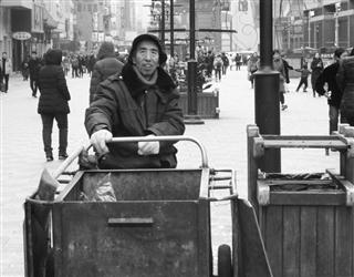 昨日下午1時(shí)許,記者在中街步行街見(jiàn)到正在收拾衛(wèi)生的趙永久。工作服袖子已經(jīng)裂口,一雙皮鞋破舊不堪。56歲的趙永久凍得流了鼻涕卻來(lái)不及擦一下,一個(gè)垃圾桶挨著一個(gè)垃圾桶往車(chē)上倒垃圾。