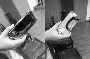 手機送到后,意外突然降臨。據(jù)姚某回憶,9月18日21時許,他拿著手機坐在家中床上玩游戲,手機突然震動,隨后手機屏幕發(fā)出“吱吱”的聲音,并冒出白色煙霧,姚某情急之中將手機扔在床上。接下來的一幕讓他更加恐慌:手機起火自燃,還散發(fā)出陣陣惡臭。事后,他發(fā)現(xiàn),涼席、床單、席夢思床墊等均被燒出手機形狀的洞。