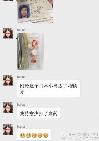 劉醫(yī)生:其實根本沒有少打麻藥。我很負責的把那個日本小伙子的牙拔了,他并無任何疼痛,走的時候還感謝了我。不過我承認自己是有點無聊,看到日本人,而且還帶著護照,就想和別人開個玩笑。就拍了張照片,然后發(fā)在了一個微信群里,想和大家調(diào)侃一下,就說少打麻藥了,就是無聊的心理。