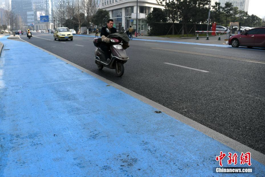 2月28日,成都市高新區(qū)吉泰路車來車往,道路兩側(cè)的非機動車道被涂上天藍色后尤為醒目。據(jù)了解,這條藍色非機動車道由成都市高新區(qū)近日打造,為騎行者推出的“健康道”。 中新社記者 張浪 攝