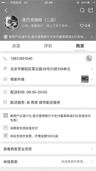 隨后,北青報(bào)記者選擇了一家距離單位最近的代購(gòu)店,點(diǎn)擊進(jìn)入后,公告一欄可以明顯看到一段提示語(yǔ):“本店為黑手-星巴克代購(gòu)門(mén)店。本店一切商業(yè)行為與星巴克無(wú)關(guān),門(mén)店信息僅供參考,有關(guān)外賣(mài)服務(wù)的問(wèn)題,請(qǐng)致電‘黑手’客服!倍跔I(yíng)業(yè)資質(zhì)一欄中,顯示的是一家物流公司,名為“北京環(huán)東物流有限公司”,從業(yè)資質(zhì)上傳的是一張“道路運(yùn)輸經(jīng)營(yíng)許可證”,經(jīng)營(yíng)范圍為普通貨運(yùn)。
